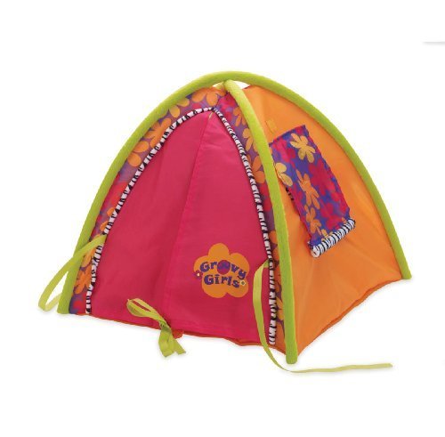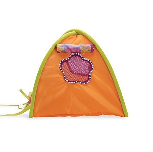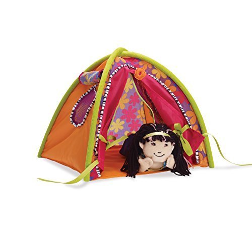 This tent features a zippered mesh door, nylon flaps that cover the tent opening and Velcro-like closures above windows that keep window coverings up. Tent is collapsible for easy storage and fits up to 3 dolls.