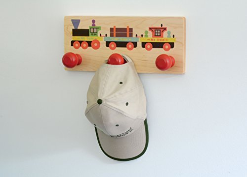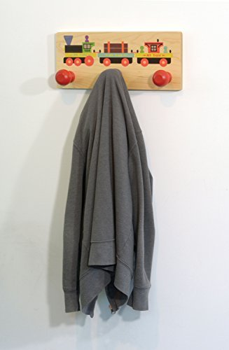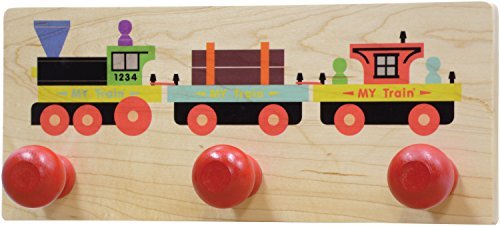 Enhance any train enthusiast's room with the MY Train Wall Rack. This 3-knob wall rack is made from locally sourced, sustainably harvested hard maple with three red hardwood knobs. Rack measures 6" high by 14" wide and has keyhole slots in the back for mounting to wall with screws (not included). The MY Train artwork includes a engine, lumber car and caboose printed directly onto the maple board.