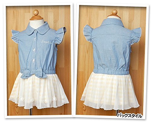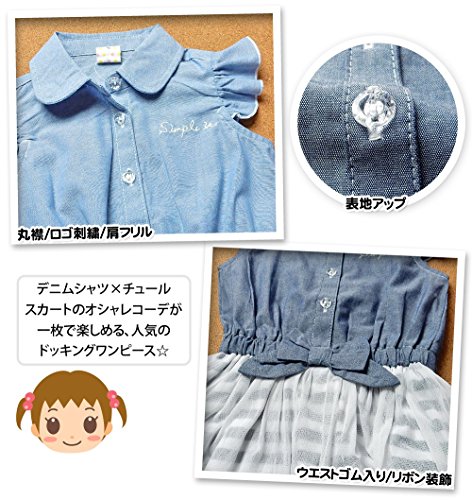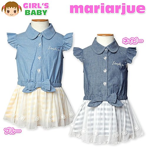 (ブルー/95cm)ベビー服 女の子 ドッキング ワンピース ノースリーブ デニム シャツ 肩フリル リボン チュールスカート ボーダー ウエストゴム入 女児 ベビー