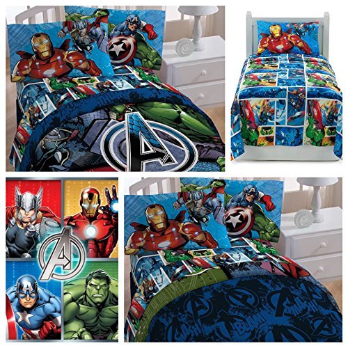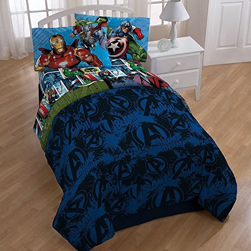 With this Marvel Avengers 5 Piece Twin Bedding Set - Reversible Comforter, Sheet Set with Pillowcase and Plush Throw Blanket your half-pint hero will take on evil evening monsters and save you from harm! The twin/full comforter is designed with each Avengers character in action. With bright colors and detailed character graphics this twin bed set is designed to be attractive, comfortable and versatile. Characters from the movie Marvel Avengers Age of Ultron and Avengers Assemble are featured. A Marvel twin size bedding set any super hero in training will love. It is made of 100 percent polyester for long-lasting durability, and all four characters are prominently displayed on the cover with the Avengers logo in the middle. This soft and cozy blanket will be sure to keep little ones warm and comfortable during the adventures they might have in dreamland. The plush throw has bright colors and great graphics that will bring a smile to your child's face. This colorful cover is designed and produced with attention to detail, sparkling colors and bold graphics. Machine wash cold, tumble dry low.
