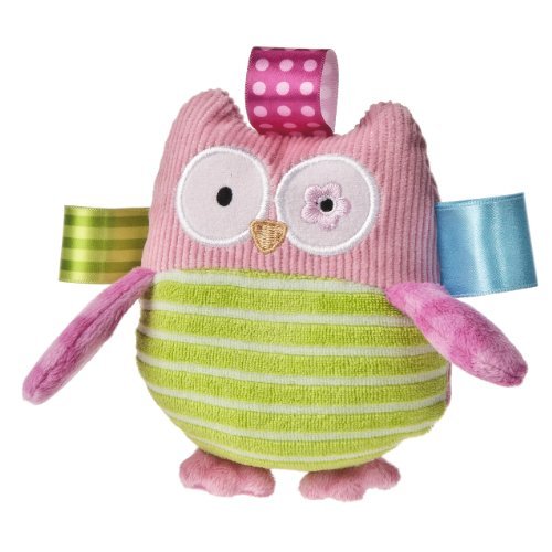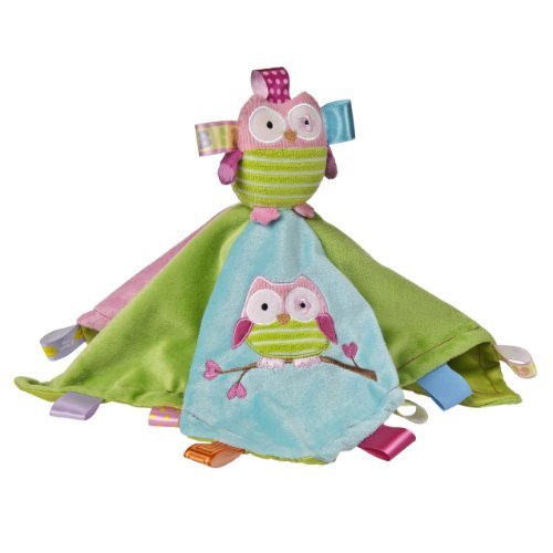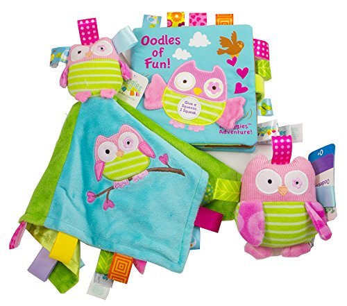 Are you looking for the perfect baby shower gift for a friend or family member? Do you want to inspire your baby to learn while they play? Here's a 3-piece set that Baby and parents will really love! It's an 8-page soft-cover book, featuring a happy owl, with textured ribbon taggies to turn the pages, and squeaker and crinkle paper inside to stimulate sound recognition and fun! And, the book is durable, washable, and strong to survive Baby's curiosity! The adorable owl character is sure to be a favorite with your baby, so we've included a matching 5" plush rattle with the same owl face and lots of taggies to help Baby hold on! We've also included a 13"x13" "blankie" for Baby to hold, with a plush owl and a fleecy soft, colorful blanket, lined with a smooth satin side! This is a baby shower gift that parents will love, because it combines a love of books with important learning skills of sight, hearing, touch, and sound...all wrapped up with lots of Oodle owl fun! Click "Add to Cart" now, to order your Taggie 3-piece adventure set today!
