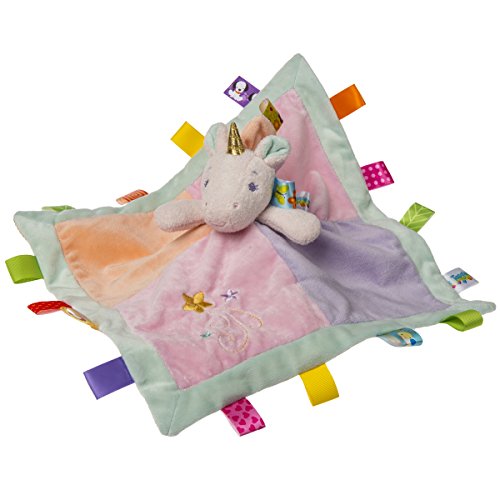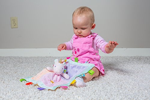 Soft, huggable unicorn toy on top of an attached 13 x 13-inch blanket;Features ultra-soft fabric and satin lining; unicorn has golden horn that adds a touch of magic;Adorned with interactive and soothing tags babies love to explore;Great for little hands to grab; use as a comforting lovey, or for playing peekaboo;Taggies toys, blankets and baby mats make great coordinating baby shower gifts
