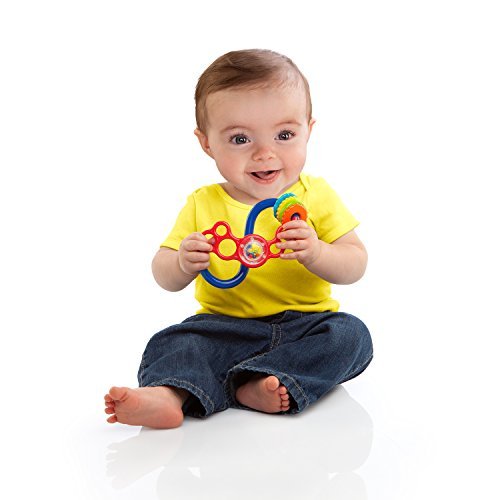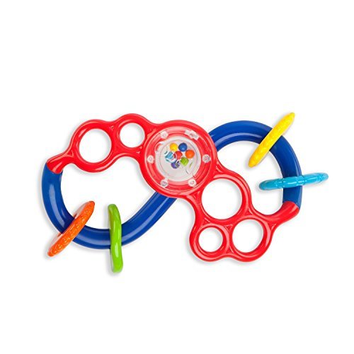 Easy to pick up, impossible to put down, the Flex & Slide is a real hands-on winner. A fussy teething baby finds comfort in the textured rings and flexible holes. Little fingers explore, hands shake and baby smiles!