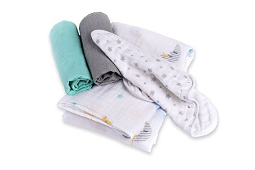 Gift set is a great starter kit for new parents, Includes 1 muslin cotton swaddle, 2 mini muslin cloths, and 1 muslin cotton facecloth, Swaddle and mini cloths 100% cotton, Muslin swaddle and mini cloths pre-washed, dual layer and softer with each use, Nicely packaged for gift giving, great for baby showers, Nicely packaged for gift giving; great for baby showers