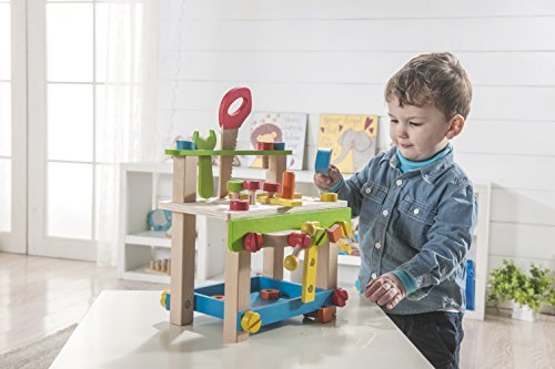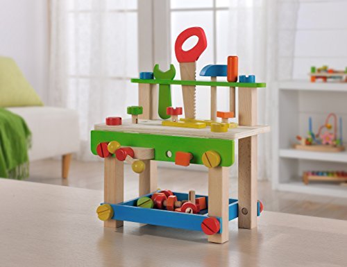 Keep your child interested and busy with this wooden workbench and kids tool set, including: hammer, toy wrench, flat head screw driver, toy saw, and working bench vice. Childrens tools and components are pre-sanded, pre-drilled with rounded corners and stained with non-toxic, BPH-free, water-based paint - so they’re kid safe. This childs tool set is fully tested to the United States ASTM F963 and European EN 71 standards, the highest consumer product safety standards worldwide. Made of wood sustainably harvested from nurseries that are FSC certified (Forest Stewardship Council). An educational toy for toddlers and preschoolers that develops your childs STEM (science, technology, engineering, and math) capabilities. Learning to use the wrench and screw driver teaches logical thinking and problem solving. Assembling nuts and bolts encourages fine motor skills. And of course, your toddler will delight in swinging the hammer. Gender-neutral wooden tool bench and colors make this a good toddler activity toy for girls and boys. The many activities let multiple children play at the same time. Perfect for play dates and families with multiple children! Assembly is quick and easy. Requires only a screw driver. Measures 21.6 x 12.6 x 27.2 inches. For toddlers and preschoolers age 3 and up. What's in the Box: 1 kids tool bench with tool rack, 1 toy hammer, 1 saw, 1 wrench, 1 screw driver, 1 bench vice, nuts, bolts, nails, boards with holes, 1 removable tool storage compartment and instructions.