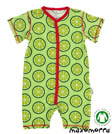 北欧スウェーデンのMaxomorraのベビー服。 ショートオールは、半袖・半ズボンのカバーオールで、 赤ちゃんの夏の定番アイテムです。 普段着としてはもちろん、おでかけ服、ナイトウェアとして使えます。 ベビー時期限定の、赤ちゃんらしい着こなしが楽しめるスタイルです。 どうぶつやのりものなど、お子様が大好きなモチーフを使った ユニークでカラフルなグラフィックデザインが人気のマクソモーラ。果物のライムのグラフィックデザインは、すっきりさわやかな印象になります。 男の子が着ても女の子が着てもかわいい、ユニセックスな柄です。 マクソモーラのショートオールは前開きの1枚着です。 首から股までつながるスナップボタンを、必要な部分だけ外すことができます。 襟ぐりと袖はパイピングしてあるので伸びにくく丈夫。ストレッチのきいた布地は驚くほど伸びるので、 股部分にスナップボタンがついていなくても簡単に脱ぎ着できますよ。 ショートオールはゆったりめのシルエットです。 ストレッチがきいているので赤ちゃんの動きにぴったりフィットして、 さらに汗もしっかり吸収します。 世界基準であるGOTS認定のオーガニックコットンを使用しています。 美しい発色を出す染料も、GOTSの審査をクリアしてものだけを使っています。 機能的でデザイン性の高いマクソモーラのベビー服は、 ご出産祝いのプレゼントにも選ばれています。