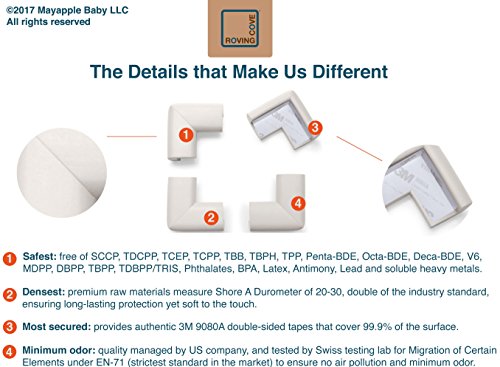 GENUINE ROVING COVE? PRODUCT: All of our product reviews are authentic. None of our Verified Purchase reviewers were given free or discounted products for their unbiased review. Beware of scam reviews. Beware of phantom sellers. Roving Cove? is a New York registered trademark is owned by Mayapple Baby? of Brooklyn, NY.;PUREST: Roving Cove? uses the safest and purest raw material available and was the first brand to make foam safety bumpers without the use of toxic flame-retardant chemicals (SCCPs). This product contains no BPA, no phthalates, no heavy metals, no latex, no SCCPs. Inherently flame-resistant; passed flammability tests under US regulations.;DENSEST: Density is more important than thicknessTM when it comes to softening impact. Roving Cove cushions measure Shore A Durometer of 20-30, much more dense than the industry standard of 12-15. Soft, high-density premium cushions absorb impact and protect your loved one from the hard, sharp corners and edges in your home or at schools, daycares, preschools, hospitals, assisted living facilities, senior facilities, senior housing, work areas, offices, museums, restaurants and more.;EXTRA CORNERS: Value Pack includes 8 premium, L-shaped corner cushions; eight is enough to fit 2 tables, the most of any product on the market. You almost always need more than four!;SECURE ADHESION: Includes authentic, easy-to-peel, premium 9080a (gray, not red backing) 3M double-sided tape on PRE-TAPED corner cushions). See photos at left for proper tape alignment. Oyster color goes well with maple, birch, alder, or light-colored furniture, such as beige, white, off-white and gray tables, chairs, chests, shelves, stairs and fireplaces/hearths | All text and photos/images in this product listing are copyrighted materials. ? 2012-2016 Mayapple Baby
