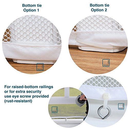 - CUSTOM FIT: Outdoor model uses weather-resistant eye-hole screws, exclusively from Roving Cove®, that screw into the wood floor or deck railing post, to secure your Safe Rail(TM) tightly and neatly. Adjust your Safe Rail(TM) easily with the releasable cable ties. Sides and bottom can be rolled back to customize length. Easy to clean: wipe down with soap and sponge or simply remove Safe Rail(TM) and wash.