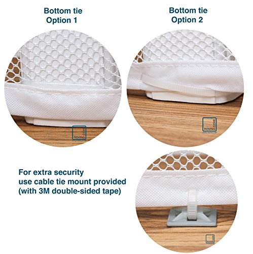 - RELEASABLE CABLE TIES: No more strings! Finally, a rail net that installs on your balcony or stair banister with releasable cable ties, only from Roving Cove®. Slip cable ties through the designated holes on the net and wrap them around the handrail, or through the strong mesh holes and directly around the banisters (balusters) or newel. No more messy strings.