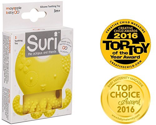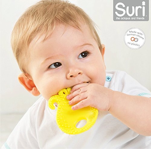 SINGLE PACK of 1 stylish, award-winning premium silicone teething toy (yellow octopus); made with German medical-grade silicone; safe, clean, non-toxic; free of heavy metals, BPA, phthalates, nitrosamines and plastics (such as PP, EVA, Vinyl or PVC) which can be scratched with teeth. One-piece construction and no moving parts make cleaning easy. Top rack dishwasher safe.;SUPERHEROES OF TEETHING! Babies love choices, so let your baby alternate between Suri? the Octopus, The Anchor and The Wheel, to grab and grip, and bend and twist, and chew and chaw, for fun, effective teething relief! Click Size 3 to view Suri teether sets.;BITE!: Each character has multiple sensory points and textures; designed to reach both front and back teeth; easy for babies to hold and manipulate; from soft and pliable to firm and resistant, Suri & Friends are effective during all teething stages!;PLAY!: Perfect nautical, marine-themed play toys; beloved characters inspire imagination; see what new adventures you and baby can create with Suri & Friends. And finally bath toys that actually sink!;COLLECT!: Mix and match all characters and colors; use the convenient strap holes to secure teethers to a car seat or stroller, or for Mom & Dad to wear Suri & Friends as trendy teething necklaces. Look for the Suri book, plush toy and more! Join the fun. Get yours today! (See product description below for more detail.)