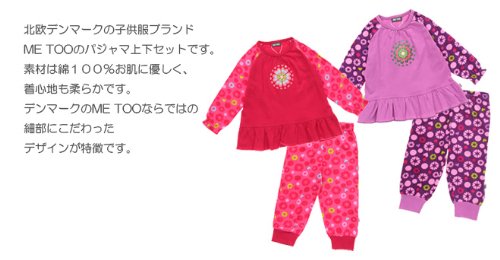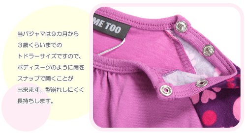 Purple Pink北欧デンマークの子供服ブランドME TOOのパジャマ上下セットです。素材は綿100%お肌に優しく、着心地も柔らかです。デンマークのME TOOならではの細部にこだわったデザインが特徴です。当パジャマは9カ月から3歳くらいまでのトドラーサイズですので、ボディスーツのように肩をスナップで開くことが出来ます。型崩れしにくく長持ちします。/インポートベビー服