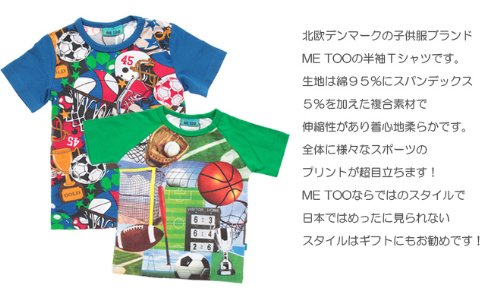 北欧デンマークの子供服ブランドME TOOの半袖Tシャツです。素材は綿95%にスパンデックス5%を加えた複合素材で伸縮性があり着心地柔らかです。全体に様々なスポーツのプリントが超目立ちます!ME TOOならではのスタイルで日本ではめったに見られないスタイルはギフトにもお勧めです!肩はスナップで開くことが出来ますので、型崩れしにくく長持ちします。/インポートベビー服