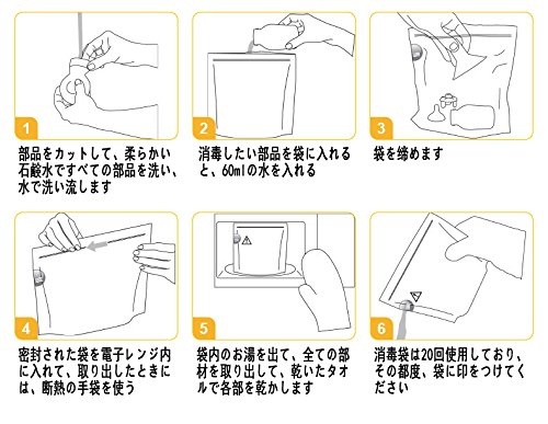 - お手入れ方法もとても簡単。お手持ちの搾乳機の部品や哺乳瓶を除菌バックに入れ、60mlの水を入れて電子レンジで加熱するだけ。
