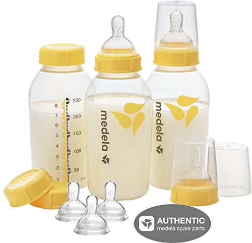 Set is compatible with all Medela breastpumps to collect, store and feed with one container.;Six medium-flow silicone nipples with natural feel and shape.;BPA-Free.;Two great Medela products (bottle set and nipple set) in one convenient package.;Contains: (3) 8 oz/250 mL breastmilk bottles; (3) collars; (3) solid lids; (3) travel caps and (6) wide-base, medium flow nipples.