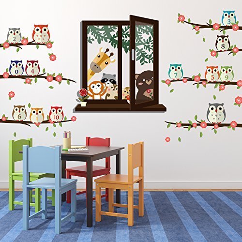 Walplus Removable Wall Stickers Window View Of Animal Friends + Nursery Owl Numbering - Nursery Kid's Room 200Cm X 105Cm Multi - Colour [並行輸入品]