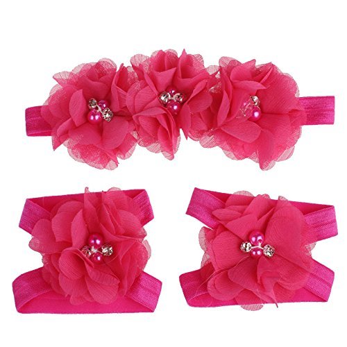 Meily(TM) Love Baby Girls Foot Flower Barefoot Sandals + Headband Set Baby Infants Girl (Hot Pink)