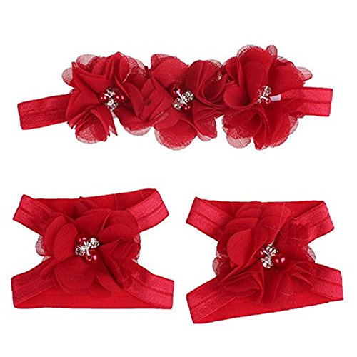 Meily ベビー用 ヘアバンドセット 裸足 サンダル カチューシャ 可愛い おしゃれ お花 赤ちゃん [全4色][レッド]