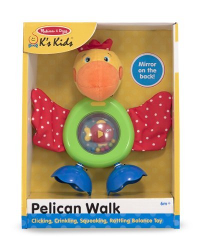 Rock the pelican from foot to foot and see baby's early-learning skills take a big step forward! With crinkly patterned wings, a big squeaky beak, a wiggly fish in his belly, and a mirror on his back, this funny fellow offers lots of incentive to touch, feel, lift, turn, and exercise early motor skills. Children can rest the pelican on either foot, balance him on the edges of both, or just have fun grasping and turning the clicking cup feet. The child-safe mirror on the reverse has a hard, flat surface that gives babies and toddlers a clear view and stands up to all a pelican's daily adventures! Melissa & Doug K's Kids toys nurture early childhood development in three key skill areas: physical, cognitive, and social. With interactive designs and multisensory features, K's Kids promotes constructive play and effortless learning, keeping interest high and new skills flourishing throughout the baby and toddler years!