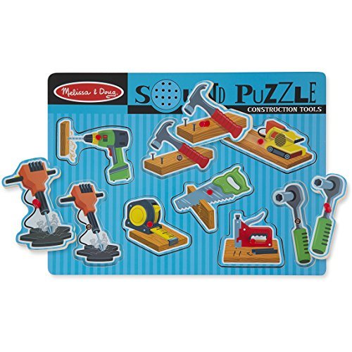 Featuring detailed images of favorite noisy construction tools, this wooden peg puzzle makes the sound of each tool when a piece is placed correctly in the puzzle board! Full-color, matching pictures are under each of the eight carved pieces, including a power drill, hammer, belt sander, jack hammer, tape measure, staple gun, and socket wrench. Easy-to-grip plastic pegs on each make the pieces easy for small hands to manipulate. The interactive, sturdy wooden puzzle helps kids two and older develop fine motor skills and auditory processing skills.