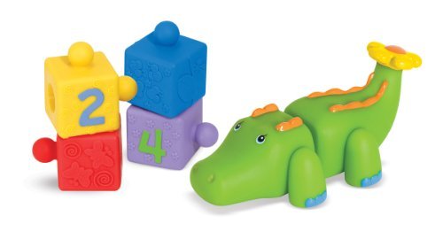 Snap together the soft plastic blocks to make one cute crocodile! This charming play set includes a smiling crocodile head, a flower-tipped tail, and four numbered blocks to build a body in between. Connect them all to make the crocodile long and lean, include just a few for a version that's short and sweet, or move the snaps to make a funny shape-- the multi-textured pieces are easy for little hands to manipulate and so much fun to pop together! With patterns, numbers, and vibrant colors, they open up unending possibilities for sorting, sequencing, and even early math skills too. What a “snappy” way to learn and play!