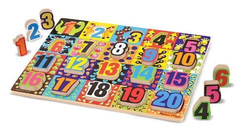 Counting fun begins with this extra thick wooden puzzle that includes 20 easy-grasp, chunky pieces (1-20). A full-color, matching number appears under each piece, and counting pictures equal to each numbered piece are shown on the puzzle board. Number pieces stand up. Encourages eye-hand, fine motor and early math skills.