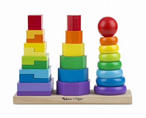 メリッサ&ダグ 木製 幾何学積み木 ジオメトリック・スタッカー Melissa & Doug Geometaric Stacker 推奨年齢 2歳以上(24ヶ月) 25個のカラフルな積み木の形状を楽しみながら合わせたり、分別しながら積むことで技能の向上を図れます。リング状のもの、八角形のもの、直角形のものなど、平面だけでなく立体の形にも親しめます。 幾何学に触れ合う第一歩として最高の知育玩具です。