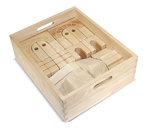 Design an architectural masterpiece with this set of forty-four hand-scrolled and turned wooden blocks in eleven different shapes. This natural finish, smooth-sanded hardwood block set is packaged in a handsome, wooden storage crate for easy storage. Great value!