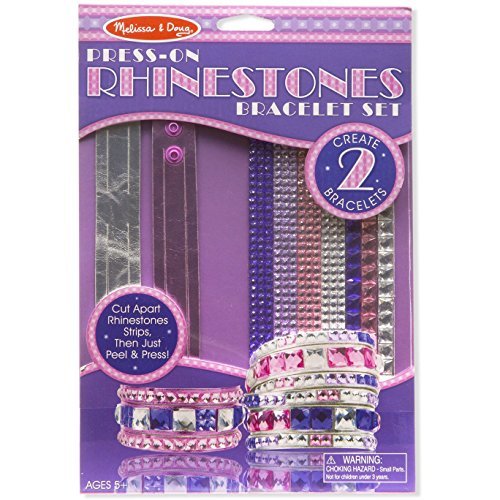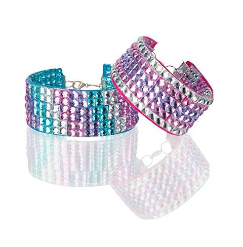 It's easy and fun to make glamorous, dazzling bracelets with this press-on rhinestone craft kit! create your own glittering designs or use the included suggestions. Use a pair of scissors to cut the multi-colored large and small rhinestones into blocks, rows, or individual gems, peel off the backing from the rhinestones, and press them firmly onto the two bracelets to create uniquely designed jewelry! encourages creativity and fine motor skills in children ages 5+.