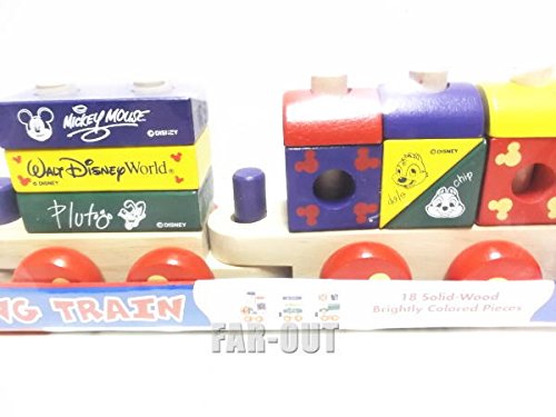 18個のカラフルな木製のミッキーアイコンや人気キャラクターが描かれたパーツからなるディズニーランドを走る汽車を、いろいろ積み重ねたり組み合わせることにより色の認識、型の区別や作成、創造力を育む