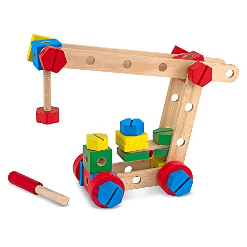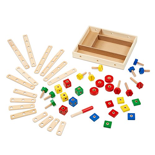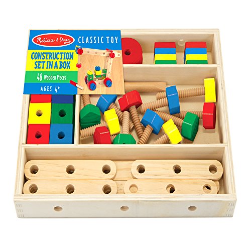 Melissa & Doug Construction Set in Box.With 48 wooden pieces, including nuts, bolts, drilled bars to connect, and a child-size screwdriver, this classic building set gives children all they need to tinker and build! Printed right on the sturdy storage box are building plans for a crane, motorcycle, airplane, and race car to get the fun started.With some imagination and a few creative twists and turns, children can make hundreds more amazing structures, too! Any time children play with this durable set, they'll be building fine motor skills, problem-solving skills, and hand-eye coordination.Included extension activities guide parents through educational activities that also build early math skills.For children 4 years +.Materials: Wood, Paint.Assembled Dimensions: 11.75" L x 9.85" W x 1.55" H (Packaged).Weight: 2.25 lbs.