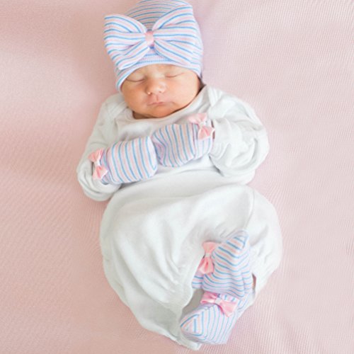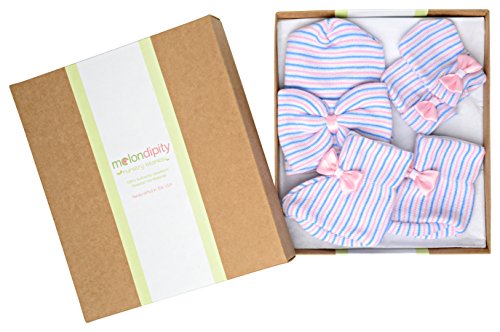 Melondipityの従来ピンク、ブルー&ホワイト新生児ガールズ帽子、ミトン& Bootie Set