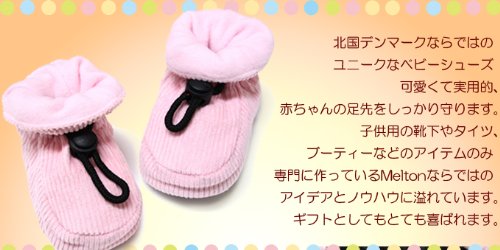 北欧デンマークならではのユニークなベビーシューズ、可愛くて実用的、赤ちゃんの足先をしっかり守ります。子供用の靴下やタイツ、ブーティーなどのアイテムのみ専門に作っているMELTONならではのアイデアとノウハウにあふれています。表地は高級感溢れる綿100%のコーデュロイを使用しているので、柔らかい赤ちゃんの足にジャストフィット!合成繊維のように「ごわごわ」しません。ギフトとしてもとてもとても喜ばれます。裏面は滑りにくいように工夫されています。室内用のシューズですので、お外用には向いていません。足首はひもで着脱できるので履かせやすく脱げにくく、足首にジャストフィットさせることができます。/ インポートベビー服