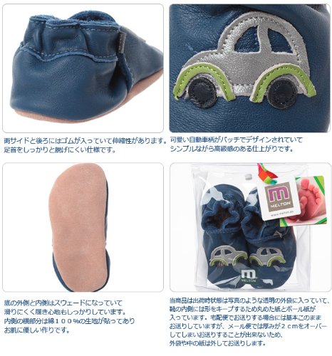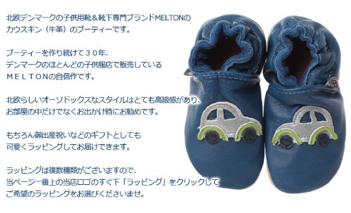 素材 牛革(カウスキン)北欧デンマークの子供用靴&靴下専門ブランドMELTONのカウスキン(牛革)のブーティーです。ブーティーを作り続けて30年、デンマークのほとんどの子供服店で販売しているMELTONの自信作です。北欧らしいオーソドックスなスタイルはとても高級感があり、お部屋の中だけでなくお出かけ時にお勧めです。もちろん御出産祝いなどのギフトとしても可愛くラッピングしてお届けできます。可愛い自動車柄がパッチでデザインされていてシンプルながら高級感のある仕上がりです。両サイドと後ろにはゴムが入っていて伸縮性があり子供さんご自身でも簡単に履けます。底の外側と内側はスウェードになっていて滑りにくくは着心地もしっかりしています。内側の横部分は綿100%の生地が貼ってありお肌に優しい作りです。/ インポートベビー服