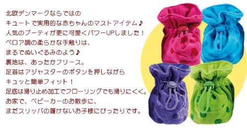北欧デンマークならではのキュートで実用的な赤ちゃんのマストアイテム♪人気のブーティが更に可愛くパワーUP!ベロア調の柔らかな手触りは、まるでぬいぐるみ♪裏地は、あったかフリース。足首はアジャスターのボタンを押しながらキュッと簡単フィット!足底は滑り止め加工でフローリングでも滑りにくく。お家で、ベビーカーのお散歩に、まだスリッパの履けないお子様にぴったりです。今回は水玉で可愛らしい!カラーも北欧らしいクリアカラー!ふっくらと高さもあるので、冬の靴下で履いてもゆったり♪病院でもスリッパ代わりに履かせていましたが、毎回看護師さん達に“かわいい~”と言われていましたよ。また、ベビーカーなど寒い時期に靴下の上から更に履くと、暖かく、脱げないので便利!ギフトにもおススメ!。/ インポートベビー服