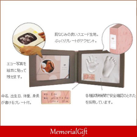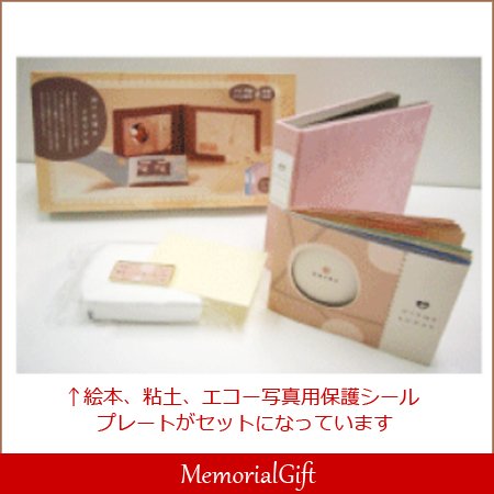 - スペック ・絵本(写真2枚、エコー5枚、16ページ) ・超軽量樹脂製粘土60g ・保護シール(エコー写真用) ・プレート(出生情報が入ります)