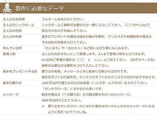 - ご注文後に絵本の製作に必要なデータ一覧をメールでお知らせします。返信する形でデータを送信してください。お届け日指定のお客様は早めの送信をお願いします。