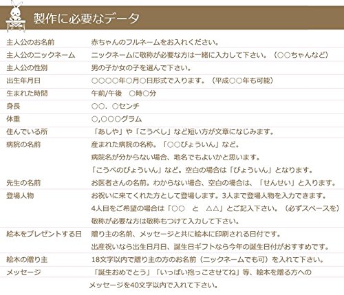 - 【あなたが絵本の主人公】0歳~ 出産祝い、出産記念、お誕生日のプレゼントに人気。登場人物は赤ちゃんが生まれた時に最初にお祝いに駆けつけてくれた人として登場。赤ちゃんが生まれた時のかわいいお話です。