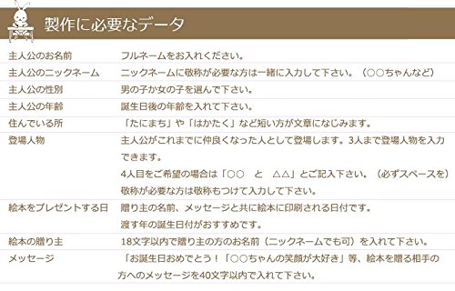 - ■印刷に必要なデータ■ 本の主人公になる人のフルネーム姓【】・名【】・ 呼び名(「あいちゃん」等)【】・ 本を渡す誕生日【西暦 年 月 日】 ・誕生日後の年齢【】歳・ 性別【男・女】 現在住んでいる所(「こうべ」や「みなみまち」等)【 】 ・本の登場人物を3人まで。主人公が仲良くなった大好きな人として登場。(敬称も含む。1人は必須)【】【】【】 ・本の贈り主の名前(「おばあちゃん」等も可)【】より ・本の贈り主からのメッセージ(20文字以内×2行まで) 1行目【 】 2行目【 】