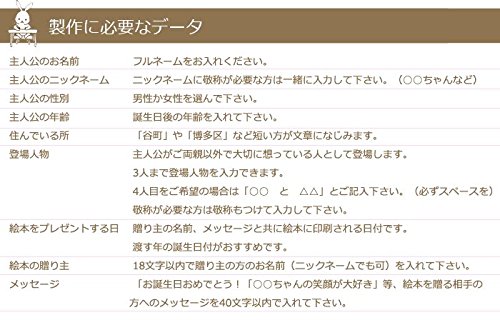 - ■印刷に必要なデータ■ 本の主人公になる人のフルネーム姓【】・名【】・ 呼び名(「あいちゃん」等)【】・ 本を渡す誕生日【西暦 年 月 日】 ・誕生日後の年齢【】歳・ 性別【男・女】 現在住んでいる所(「神戸」や「二見町」等)【 】 ・本の登場人物を3人まで。主人公が仲良くなった大好きな人として登場。(敬称も含む。1人は必須)【】【】【】 ・本の贈り主の名前(「おばあちゃん」等も可)【】より ・本の贈り主からのメッセージ(20文字以内×2行まで) 1行目【 】 2行目【 】