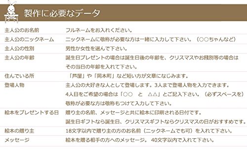 - ・種 類 : クリエイト・ア・ブック(大人向き絵本) ・サイズ : 縦211mm×横175mm(B5より小さいです) ・本 文 : 日本語 ※ 名前などオリジナル部分はひらがな・カタカナ・漢字も可能ですがふりがなはつけられません。 ・ページ数: 35ページ