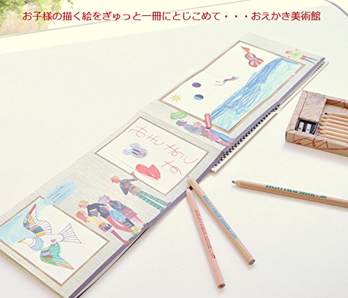 美術館にみたてたジャバラ状のおえかきブック! 額縁の中に絵を描いて、オリジナルの本を完成させましょう。 ジャバラ状の本を開くと・・・美術館の壁と絵のない額縁がずらり! 額縁の中に自分で絵を描いて完成させる、おえかきブックです。 片面は「昼の美術館」。評論家に親子連れ、たくさんのお客さまが 名画を鑑賞にやってきます。 もう片面は「夜の美術館」。泥棒が名画を狙ってる!銅像が動き出した? そんなあそび心と風合いのあるイラストが、子どもの絵を引き立てます。 おえかきはもちろん、附属のステッカーを貼ったり、 ぬりえ部分に色をぬって楽しんだり、写真を貼ってもOK。 使い方は自由自在です。 ジャバラ状なので、完成したら作品を広げて飾るのもおススメ。 お絵描きブック 本体サイズ W186×H181mm カバーサイズ W186×H183mm ミックス色鉛筆(20本入り) 色鉛筆セット:W224×H143mm 生産地:日本