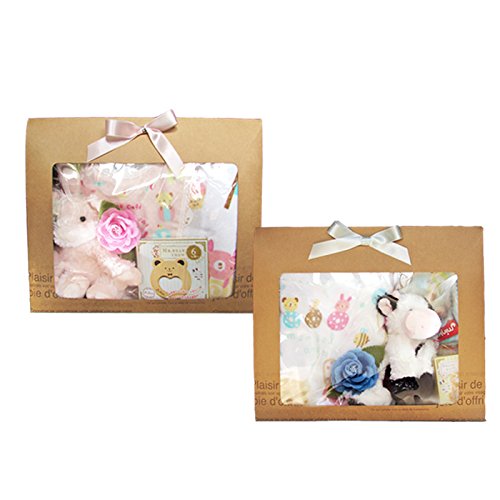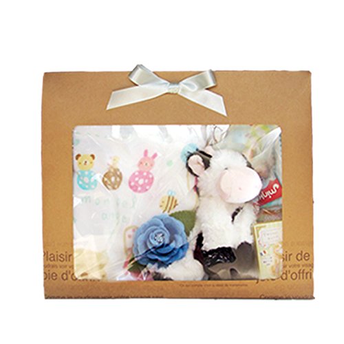メモリアルギフト ベビーギフトセット 出産祝向き (洗えるぬいぐるみ 牛, ブルー)