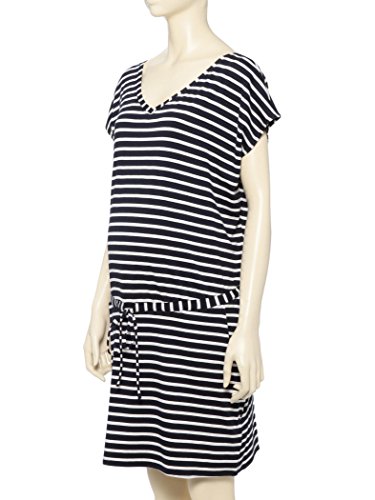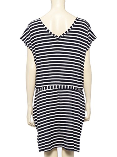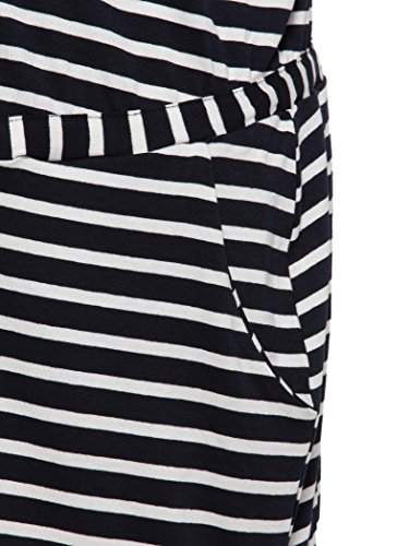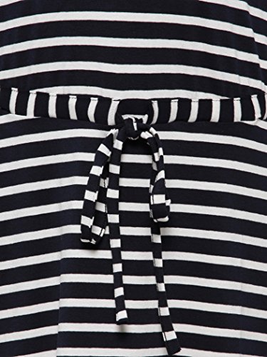 伸縮性に富んだ着心地よい仕上がり。Vネック開きでデコルテまわりをすっきりと、ネイビーのボーダーが程よくカジュアルに見せてくれます。フロントのリボンとポケットがさりげないアクセントをプラス。暑い季節の妊婦さんにも、さらりと着こなして欲しいひと品です。