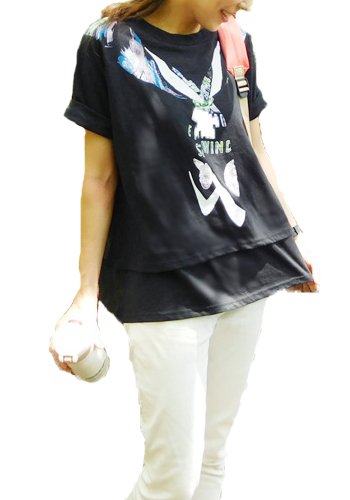Milk tea 授乳服 マタニティ トップス Milk Tee 「スカーフ柄」 ブラック 重ね着風 サイドスリット 授乳 授乳口付 春 夏 秋