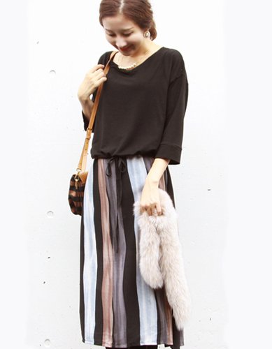- マシュマロみたいな柔らかいトップスとスタイリッシュなストライプスカートを重ね着しえいるような 授乳服 マタニティ ワンピース