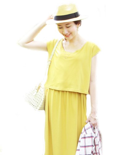 Milk tea 授乳服 マタニティ ワンピース カップ付重ね着風マキシワンピ マスタード カップ付