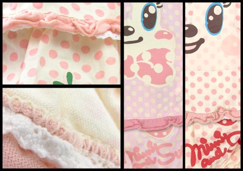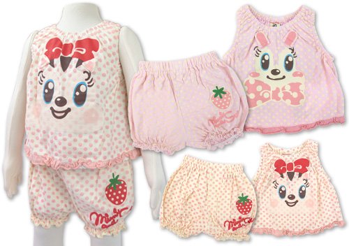 ミミ&スーのニッコリミミorスーのフェイスプリント入りキャミソールとショートパンツのセットです。 汗を吸収しやすく、ニット生地では定番の肌着やTシャツによく使われる天竺綿使用 全体が水玉柄の上下セットで超カワ フェイスプリントのお耳の部分は別縫いで立体的☆キャミの裾はフリル&レースがチラリでとってもCUTE☆ お色はミミ(うさぎ)、スー(リス)の2色展開です サイズ: 80/90/95 カラー: ミミ(うさぎ)/スー(リス) 素材: 本体・綿100% 原産国: 中国