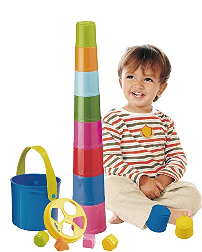- When stacked, cups measure 36 inches high. Suitable for children aged 12-24 months.