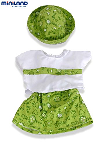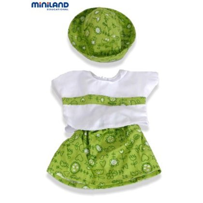 Product Description Miniland's 2-piece Green Dress with Cap for 15.75'' Baby Dolls is a delightful addition to your child's doll collection. This cheery 2-piece set is a perfect warm weather outfit for your child's doll. The green print skirt goes with a white t-shirt that has matching trim. Complete the outfit with a green print bucket cap the doll can wear with the brim rolled up or down. Miniland Educational, a leading toy manufacturing company with production facilities in Onil, Spain, is known worldwide for safe, high-quality educational toys. Playing with doll clothes helps children strengthen their small motor skills, allowing them to become familiar with different fastenings. Role play with dolls helps children develop their imaginations and creativity. Suitable for use by children age 3 and over, this outfit will fit most dolls up to 15.75'' tall. A great deal of thought and research goes into the design and production of Miniland Toys, but we never forget the importance of play! From the Manufacturer White short sleeve shirt with green skirt. Matching cap included.
