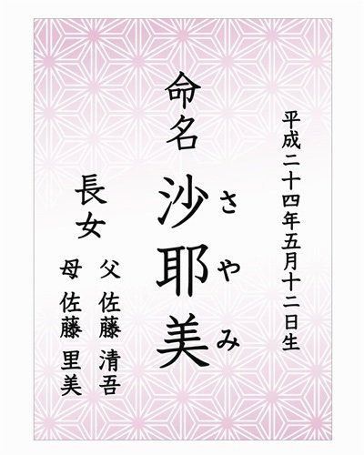 - 赤ちゃんの名前・生年月日・続柄・ご両親の名前が入ります。